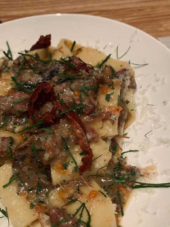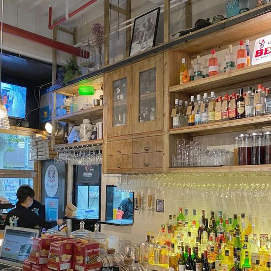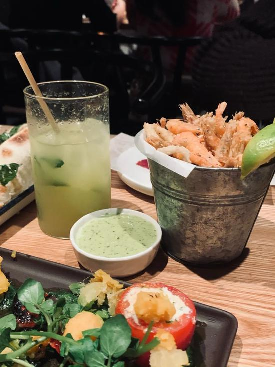 酥脆的椒盐小河虾和鱿鱼,筋道的牛尾手工意面,果木炭烤比目鱼都非常推荐。虽然食材混搭,但呈现的口味还是可圈可点的~店里的酒单也十分丰富且用心,适合三五好友来小聚一下。