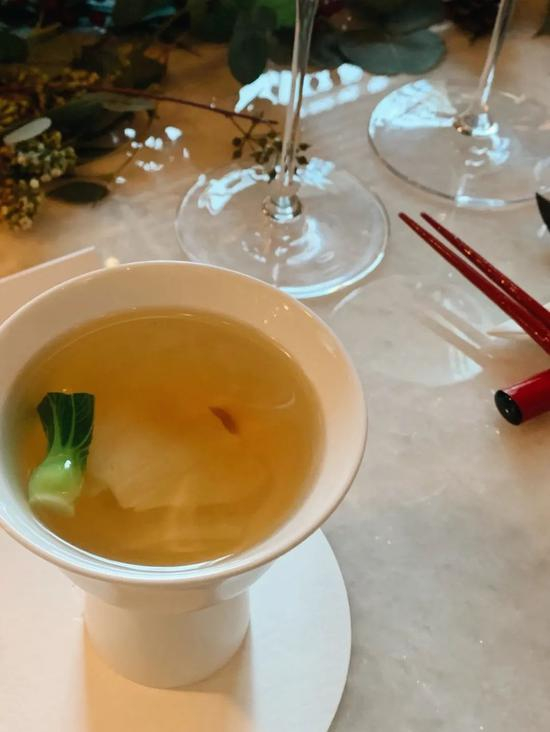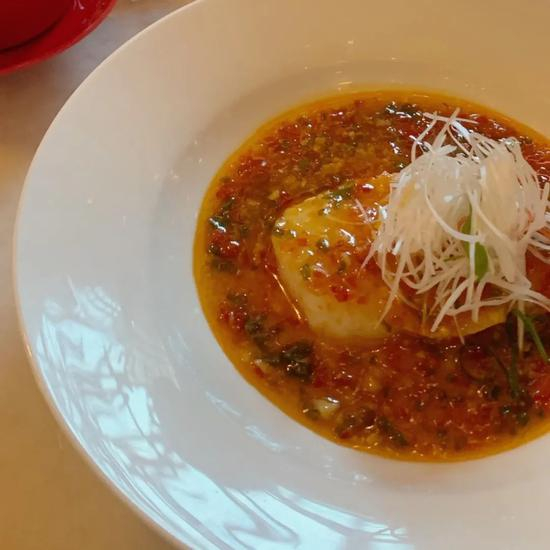 例如这道看起来清澈,但口味浓醇的花胶鸡牛汤,喝得出料理的用心。鱼香蒸鳕鱼有川味的辣,柔和不抢鱼鲜。