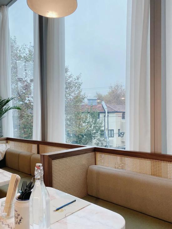 靠窗一排的藤编沙发营造出一个个小包厢的感觉,米色与草绿的配色也是十分和谐养眼。环境悠闲,绿意盎然。