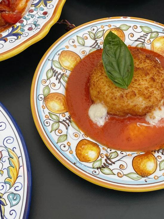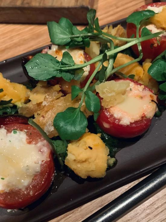 最值得夸一夸的还是这里的出品,菜品基本可以盲点不踩雷。不可错过的是烤芦笋,鲜嫩多汁还带着炙烤香气。Burrata cheese也是店里的招牌,我们点的酥炸做法,配上烟熏番茄汁和罗勒,香浓不腻。