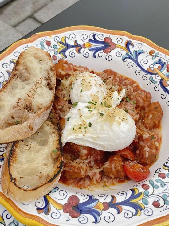 我们是两个人用餐,点了5道分量就刚刚好。热腾腾的番茄奶酪烘蛋用自家制法包蘸着吃,很适合冷冷的冬日。Granola酸奶的特别醇厚浓郁,口感丰富。