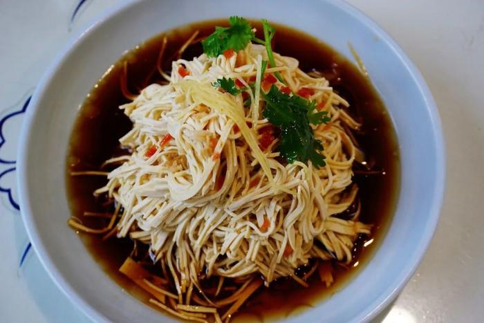 豆腐干切成细丝,再用沸水烫上几遍,最后放上配菜和调味汁,口感软嫩,很是好吃。