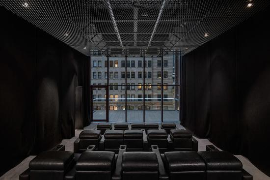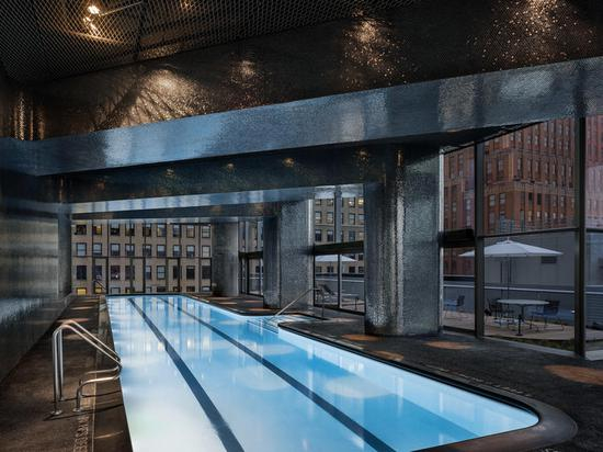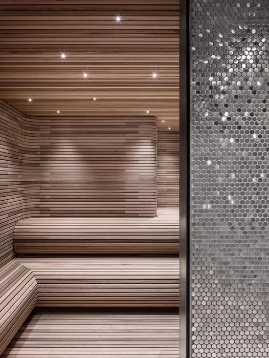 室内游泳池所在的空间设计得低调又别致。墙壁、支柱和天花板上都用带有金属光泽的瓷砖做了装饰,在悬挂于金属网之上的 LED 灯的照射下,整个房间有了一种微微闪亮的效果。这两层空间中,还有一处健身中心,里面有瑜伽室和一间用细木条装饰起来的蒸汽房。人们还可以到摆放着黑色皮沙发的室内剧场看剧,也可以使用阅览室、餐厅、厨房、会议中心和儿童玩乐区等设施。