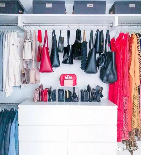 比如,出演过《公主日记》的明星Mandy Moore,她的衣帽间就格外简洁。她把大一些的包包都挂到挂杆上,小包放在柜子上,用PVC架隔开,一切都整整齐齐,感觉强迫症都好了。