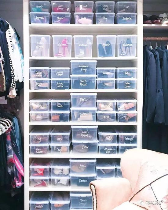 演员Abigail Spencer的衣帽间也非常规整。她把自己的鞋子都放到透明的收纳盒中,还写着品牌名,既能防尘,又显整齐。