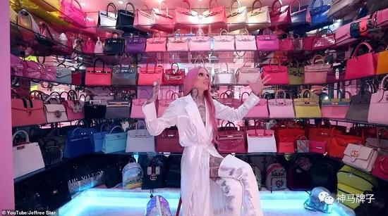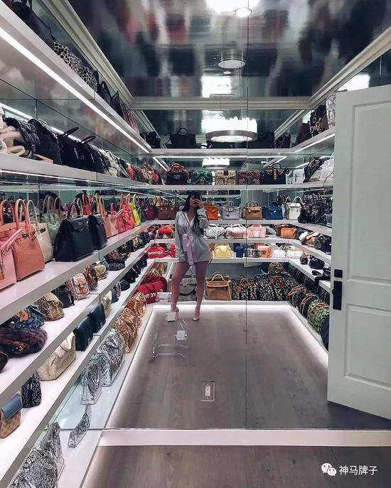 凯莉还专门整理了一个衣帽间来放包,各个款式、颜色应有尽有,看起来比专卖店的货架还满,给人一种走进“皮具城”的感觉。