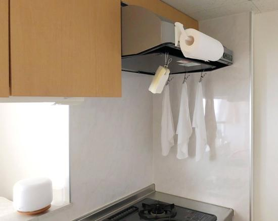 可以买这样的小钢构,挂在油烟机底部、或者墙壁上,挂些轻巧的清洁工具,超实用!