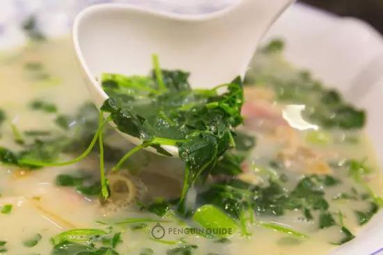 河豚还有一个美好的伴侣叫做秧草,俗称“草头”。其色泽碧绿青翠,质感柔软鲜嫩,与河豚同烧不但可以解腻,据说还能解毒。清心沁脾的草汁还带领醇厚的河豚肉走向妙曼口味的新一波高峰。