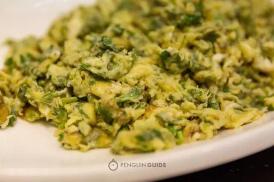 但更接地气的还是香椿头炒鸡蛋,椿芽和蛋液拌匀,滑入油锅,哗啦一声就涨成蓬松灿黄的一大朵。香椿的气味被热油激得淋漓尽致,再配一碗白饭,这春意盎然的一餐,拿什么山珍海味都不愿意换。