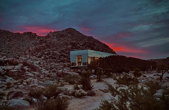 曾参与制作《American Psycho》和《Spring Breakers》的著名电影制片人 Chris Hanley 联手建筑师 Tomas Osinski 一同设计了一座名叫 Invisible House 的镜屋。这个坐落在美国加州约书亚树偏远沙漠的钢架房屋全身以镜面玻璃覆盖,通过镜面可反射出令人惊艳的沙漠景观,从内部则可以欣赏到 90 英亩的广阔自然风景。