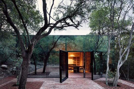 墨西哥建筑师 Tatiana Bilbao 则在墨西哥城北部的树林间,用镜面玻璃打造了一个名为 Los Terrenos(The Terrains)的度假屋,镜面的设计使其在树丛中融为一体。