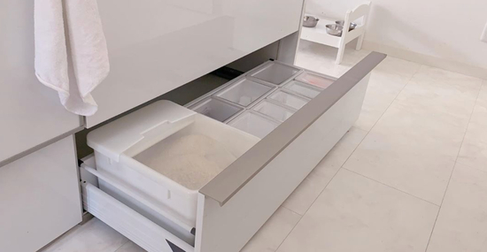 很多人家会在橱柜最底层做出一层抽屉,用来放置日常吃的大米、白面等。这样就会很方便,无需再让这种“重量级”食物占据厨房空地了。