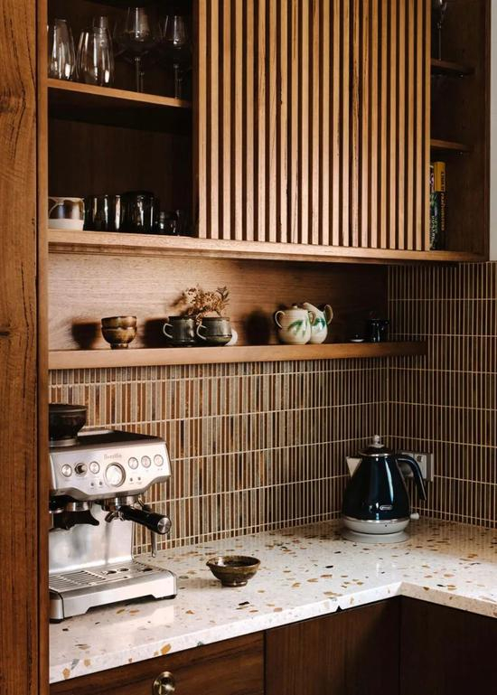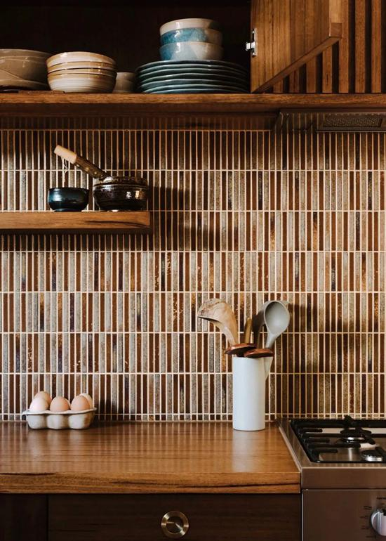 一直到二人去到日本旅行之时,才获得了最佳的灵感。她突然感觉日式侘寂风格的瓷砖才是家中厨房的绝配。这种咖啡色外加细节处有着细微变化的瓷砖,与家中家具木质的纹理可以天然的融合在一起。