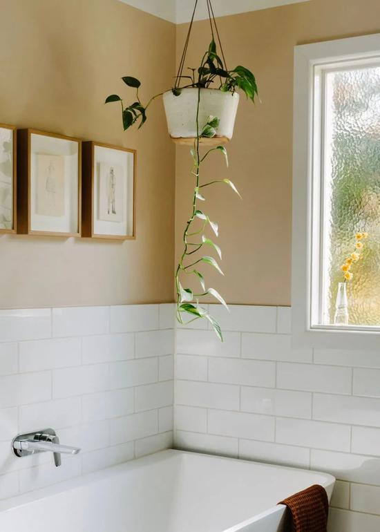 首先整个墙面被他们都涂成了乳白色,然后浴室则选择了淡杏色。进门处则贴上了设计师 Kelly Wearstler 所创作的墙纸。
