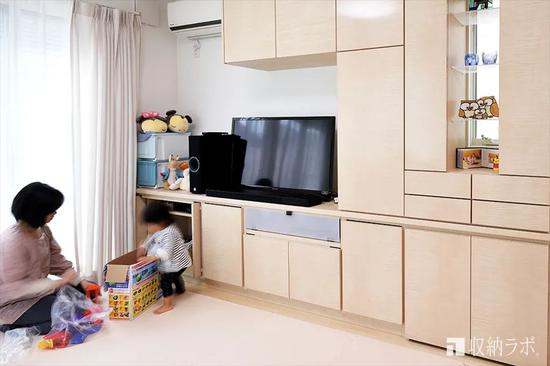 或者将电视柜与小朋友的玩具柜结合,靠近地面的一层作为玩具柜,方便小朋友自己拿取,用完还可以鼓励他自己放回去,从小培养好习惯。