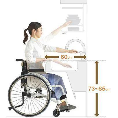 像骊住的整体厨房,就有一个系列是专门为轮椅使用者开发的,为了方便坐立时的操作便利,台面的进深被做成了60cm,而操作台的高度则可以根据使用者的身高,从73-85cm中间选择。
