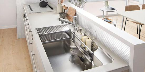 而且因为日式水槽的水口位置都比较靠后,所以水槽柜内前侧会有一个比较完整的储物空间。