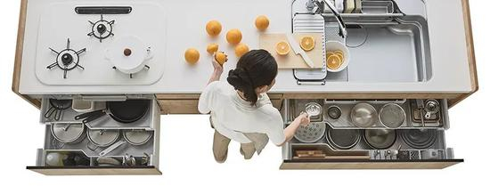 尤其是橱柜,像我们印象里最难用的灶台下柜和水槽下柜,日式定制柜硬生生能给做出好几层,收纳抽全打开,哦豁!妥妥一个小仓库!