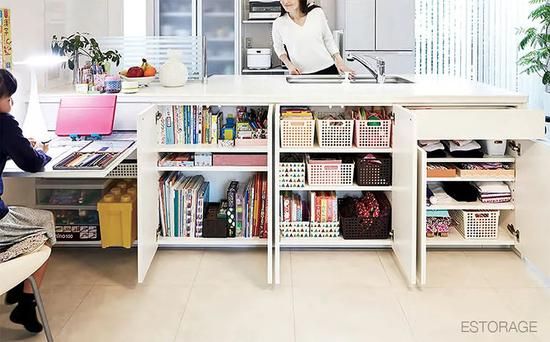 考虑到日式装修大多采用“LDK“的布局,岛台常处于核心位置,所以在岛台外侧也常常会设置储物区。