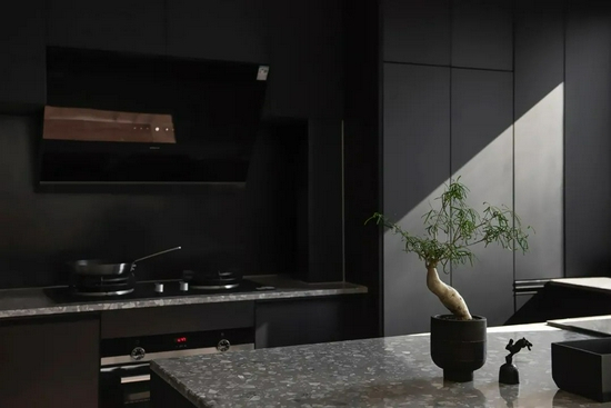 厨房整体以黑色为主,灶台区不锈钢板直接上墙,耐脏好打理,搭配水磨石橱柜台面,视觉上更整体。