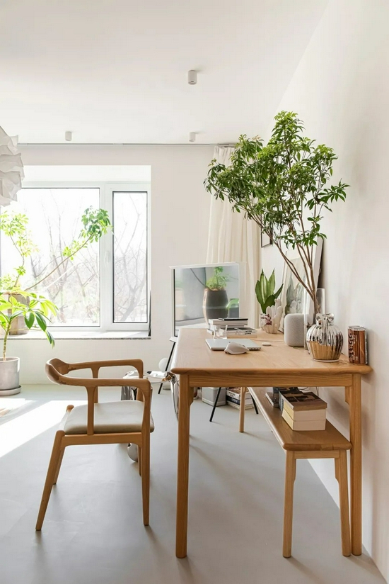 从玄关一进来就能看到客厅窗外的树,这也是屋主选择这套房子的原因之一,春夏坐在沙发上,就能看到满眼绿色,对于城市中生活的人来说相当难得。