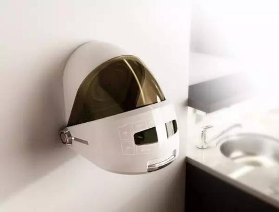 可以直接挂在墙上的新式微波炉,采用了圆形设计,体积更小,不占用空间。触摸式的按键,可以设定火力大小和加热时间,满足加热不同食物的需求。