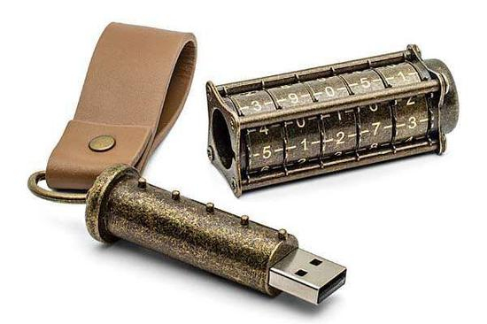 这是一个密码锁全金属U盘,机械密码锁结构,灵感来自达芬奇密码筒。达·芬奇密码筒是同名电影中剧组根据达·芬奇手稿复制出来的。其造型古典,内涵着文艺复兴特质,设计之优雅,符合达·芬奇的睿智风格。按照故事情节,密码筒里藏匿着关于郇山隐修会乃至整个基督教最大秘密的纸卷。要打开密码筒,必须解开一个五位数的密码。密码筒上有5个转盘,每个转盘上有26个字母,可能作为密码的排列组合多达11881376种。