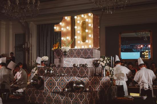 “Puttin’ on the Ritz”十周年庆典于酒店华丽的大宴会厅举办,浅蓝的梦幻,鎏金的璀璨,柔和而饱满的色彩搭配出整场精致设计的酒会,华美的水晶吊灯和一架欧式钢琴,在增加了庆典气氛的同时,更在细节之处倍添精彩,一脉传承着酒店高贵优雅与精致得体的文化精髓。