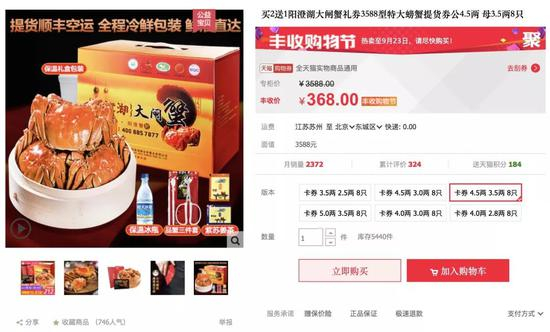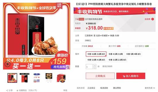有店铺中大闸蟹的预售价格要大大低于市场价格,比如图中这家店销售的阳澄湖大闸蟹礼券,4两的公蟹和3两的母蟹共8只,原价2988元,活动价居然只需要318元。