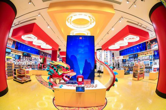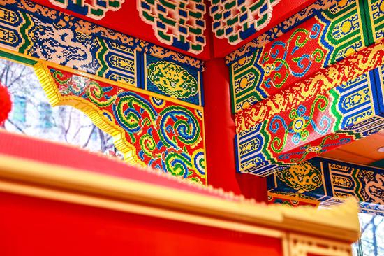 北京王府井乐高品牌旗舰店的设计体现了浓厚的中国传统文化韵味。店内陈列了多个大型乐高® 3D模型,其中包括以故宫为灵感创作的巨型屋檐(由220万块乐高®积木颗粒拼搭而成)、巍峨的长城景观、传统中式轿子、栩栩如生的石狮子模型和马赛克画龙柱。