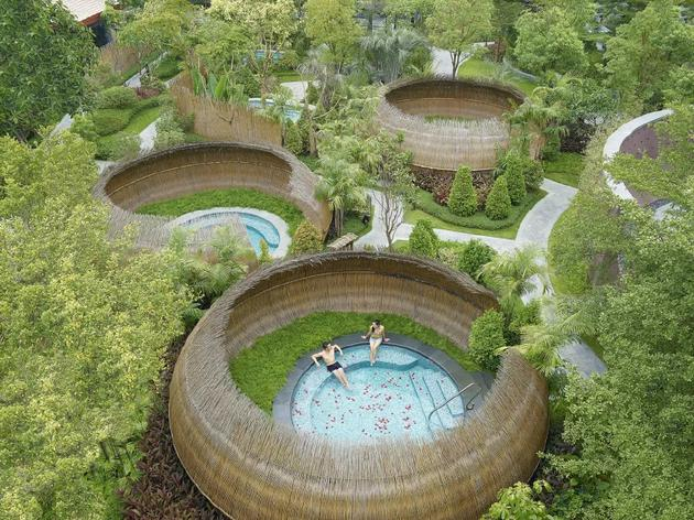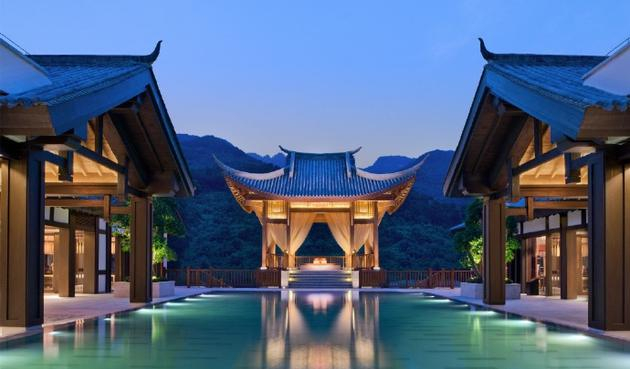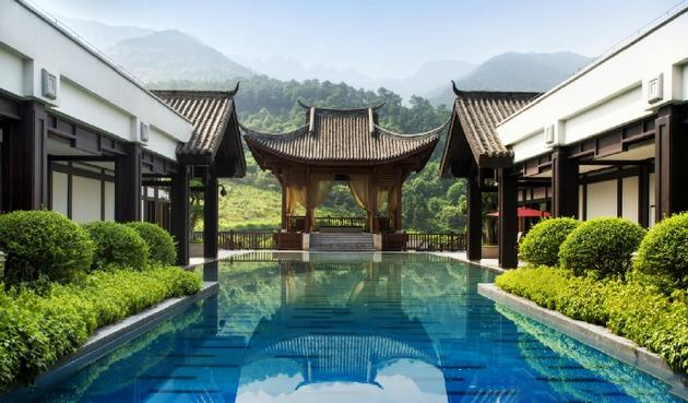 想要更有气氛一点,还可以去重庆北碚的这家悦榕庄,集传统的古风和轻奢于一身,还是《琅琊榜》的取景地,光是去打卡就很值,更别说还有高品质的温泉享受了,在酒店的每个房间阳台上,都有引自天然古老北温泉水的私人泡池。简而言之,这是一家度假氛围和服务水平都很高的山中秘境。