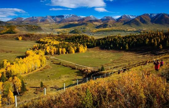 但白哈巴村的秋色,真的美得像仙境一般,阿尔泰山的皑皑雪色,到白桦树的金黄,还剩些浅绿的草地,交织成了一幅别致的油画。