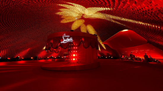 空间中央的圆形舞台与建筑结构相得益彰。舞台以透明银色幕布遮蔽,灯光从地面延伸而出,光影之间更显简约纯白场景的别样魅力。舞台四周设有圆柱形座位,与红色地板交相辉映,向Christian Louboutin奇妙艺术世界中最具标志性的一抹红色致敬。