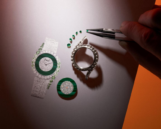 为了呈现最佳有层次的渐变效果,收集和选取完美适配的宝石耗费了数月时间。PIAGET伯爵的宝石鉴定大师们不仅需要为每件作品创造最佳的渐变效果,还需要将渐变层次与该系列的每只腕表匹配。对PIAGET伯爵而言,色彩搭配与明暗调节极其重要,大师们精心选取了特别的颜色层次与孔雀石表盘形成强烈对比。