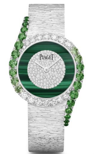 PIAGET伯爵Limelight Gala系列Precious珠宝腕表是一件集璀璨光辉、无瑕纯净与生命活力于一身的上乘之作。在非对称的表圈上,娇艳翠绿的沙弗莱石与剔透闪耀的钻石,以渐变色调镶嵌在孔雀石表盘外围,呈现一种优美妩媚之态。PIAGET伯爵对孔雀石表盘的选择有着最高标准。每颗半宝石都必须颜色鲜艳,有鲜明对比的规则纹理和柔美的曲线,并且其结构中不能有杂质晶体存在。这件时计有一个直径为32毫米的白金表壳,孔雀石表盘与采用雪花铺镶钻石的中心圆合为一体。观察敏锐的人会注意到这种“形中有型”的设计是PIAGET伯爵一贯擅用的主题,而这款腕表也继承了PIAGET伯爵经典风格的灵感。
