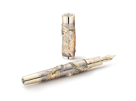 全新万宝龙“龙之巡游”系列璃龙限量款书写工具(全球限量8支)18K白金笔帽和笔杆上盘卧着璃龙形象,龙身整体镶嵌绿色沙弗莱石、帕拉伊巴碧玺以及绿色和蓝色青玉,斑斓的宝石色彩生动再现了龙鳞细节与潜居的岩层环境。龙睛以沙弗莱石点缀出威严神采。龙脊和龙首均以镀金装饰,龙爪则由白玉打造。笔帽和笔杆精心镌刻水波纹,意寓吉祥。18K金笔咀镶嵌有沙弗莱石,并精心镌刻翻开的书本图案,象征知识与教育,亦致敬传说中雅好斯文的龙之八子负。18K金笔帽前端镌刻龙首图腾,笔尾末端同样采用18K金打造,并特别镶嵌一颗绿色沙弗莱石,笔帽顶端镶嵌以钻石构成的万宝龙六角白星标识光彩夺目。
