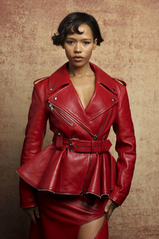 Taylor Russell身着Alexander McQueen亚历山大麦昆2023早秋系列红色皮革饰裙机车夹克和开衩半裙,搭配The Jewelled Hobo迷你指环包和Punk带饰凉鞋出席1月14日周六在美国洛杉矶举办的BAFTA茶会派对。