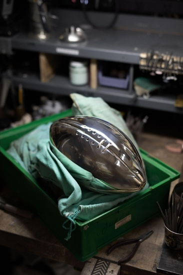 在罗德岛坎伯兰的蒂芙尼器具工坊中,技艺高超的蒂芙尼工匠们耗时约4个月,总工时72个小时打造出高22英寸(约55.88厘米)的文斯·隆巴迪奖杯。该纯银奖杯不仅沿用历史悠久的传统技艺,更融入尖端创新技术,从卷边铆接、银器制作、雕镂工艺,到手工雕刻与抛光打磨,无不彰显着蒂芙尼无与伦比的匠心传承。每年,这些工匠大师们都会在器具工坊内制作逾65个奖杯,为各类体育赛事的荣耀冠军喝彩。