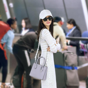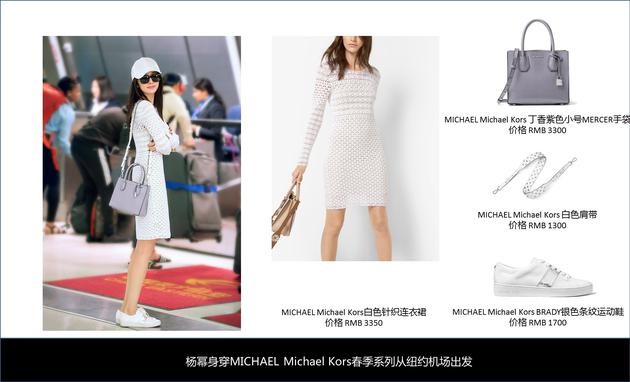 2017年5月02日,杨幂受MICHAEL KORS品牌与设计师之邀赴美出席誉有“时尚界奥斯卡”之称的纽约大都会博物馆慈善晚宴(MET GALA)后。结束了在纽约的行程,杨幂在机场现身,身穿MICHAEL Michael Kors 春季白色针织连衣裙,身背小号丁香紫色MERCER手袋及白色铆钉肩,脚踩银色条纹小白鞋,充满春天的气息,低调吸睛。