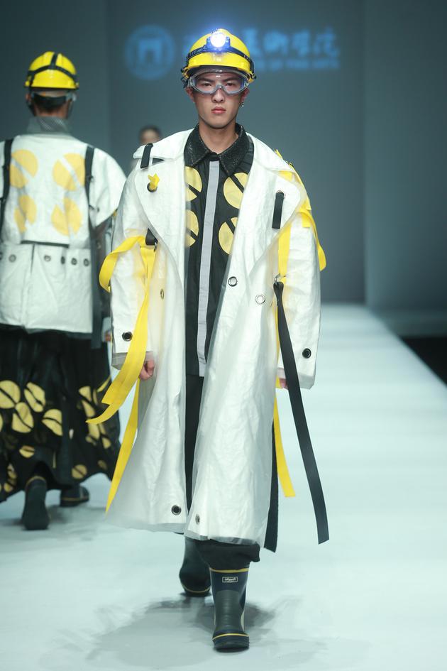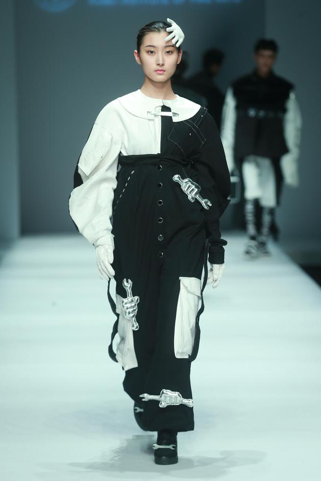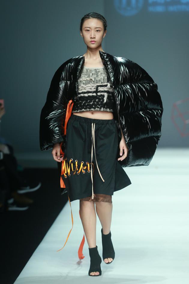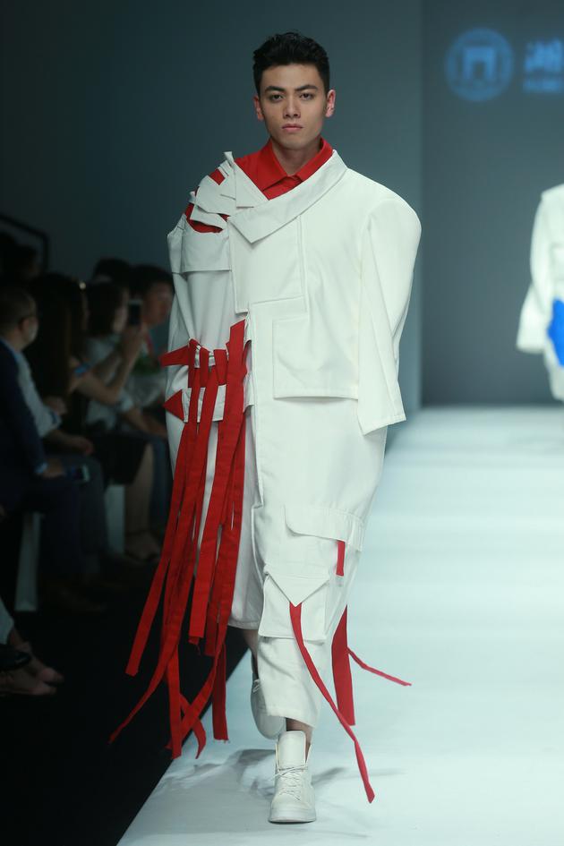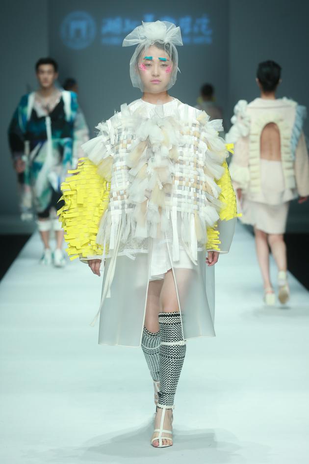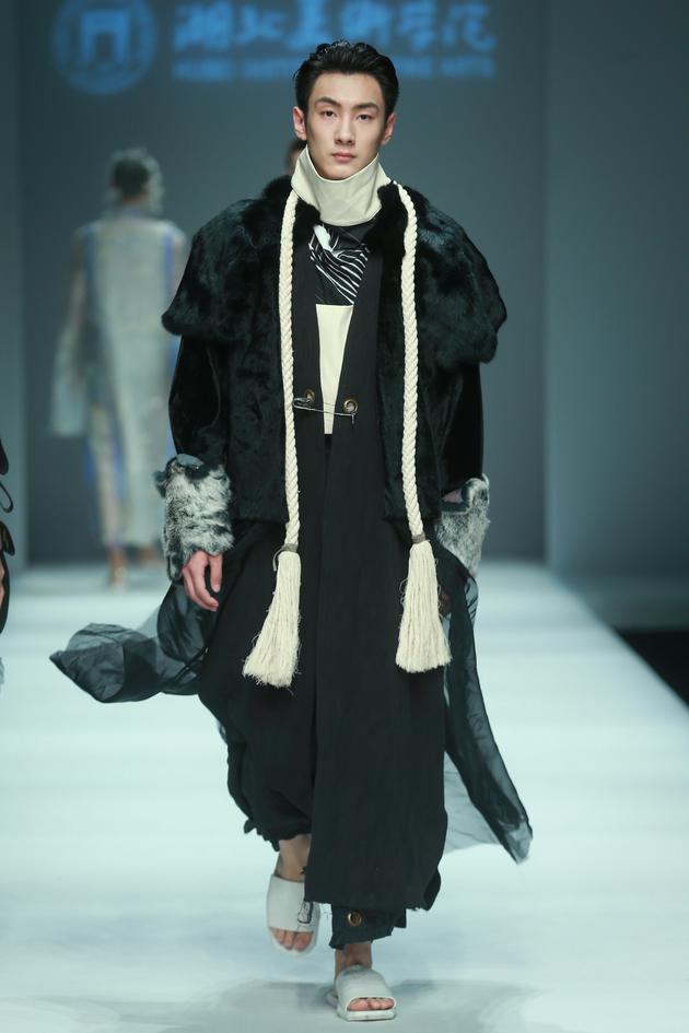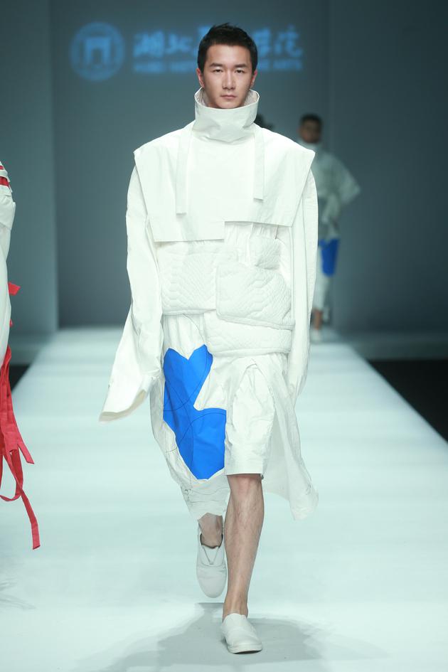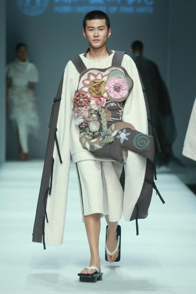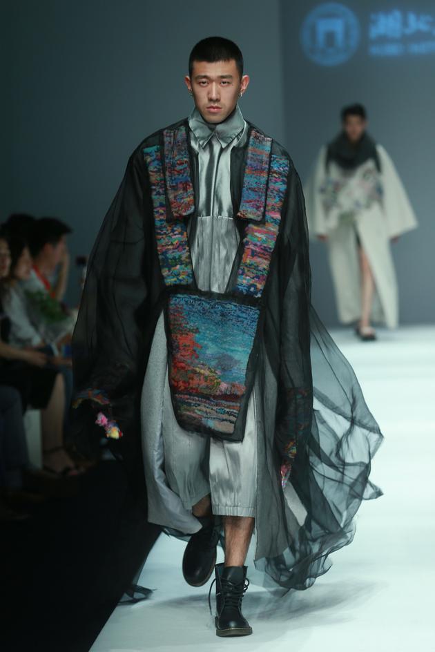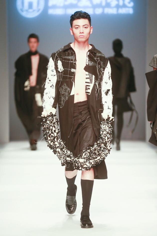湖北美术学院服装艺术设计系在尚坤塬·2017中国国际大学生时装周中展出近80套优秀毕业设计作品,每件作品都凝聚着新锐设计师对生活点滴的瞬间。其中第24届“汉帛奖”优秀奖获得者秦朗同学毕业设计作品《鲸病》,灵感来源于对朋友的人性分析,用鲸鱼的生存方式比喻朋友在情感里私人空间的矛盾。这种感性与理性、柔软与坚硬的对比,让设计师结合大量的服装工艺,如钉珠、刺绣和绗缝等手法,表达个人情感与生活的互换。欧阳润东同学设计作品《漫游癖》反映了当下学生对生活的一种关注,发现年轻人白天在条条框框里生活谨言慎行,晚上却在没有束缚的另一个世界漫游,设计师通过服装简洁的造型与流畅的线条表达出服装自由的独立存在,无拘无束,此系列作品荣获第十九届“真皮标志杯”中国国际皮革裘皮服装设计大赛优秀奖。“九牧王杯”第二十二届中国时装新人奖入围作品《the Nightingale and the Rose》,灵感来源于王尔德的童话故事,设计师姜盈同学运用厚重的织物设计与服装的形态表达出王尔德对爱情观的理解。王婷婷同学设计的作品《瘟疫·免疫》,将露宿街头的流浪汉置于自己创作的视野,他们对美的另类追求,该系列运用叛逆颠覆的朋克元素和绣色彩鲜艳、热情奔放的山西民间刺绣及牛仔的结合运用,意欲表达自由不羁和随性的人生态度。汤凤翥同学的设计作品《DOCTOR&PATIENT 》 灵感来源于医患关系社会热点事件,以暗黑的风格,来讽刺医疗纠纷事件中的血腥和暴力,该作品入围第二十届“真皮标志杯”中国国际皮革裘皮服装设计大赛。张司晨同学毕业设计作品《我与里希特的对话》入围第五届“石狮杯”全国高校毕业生服装设计大赛,该系列将模糊的图像与情感相结合,体现出时尚艺术的不稳定性、迷惑性与情节性。