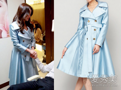 宝蓝色风衣来自韩国设计师品牌Avouavou,包包来自Roger Vivier Miss Viv‘ 漆皮小号肩包。选择仙嫩的粉色,符合金喜善冻龄女神的特色,贵妇气质少女心。