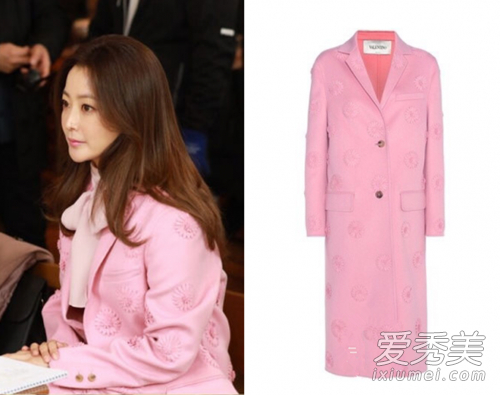 大衣来自Valentino,仙气小姐姐的代表品牌。这么大面积的粉色本来不是很适宜成熟女性,也就金喜善的颜能hold住了。