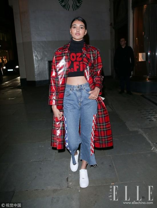 露胃短上衣自带时髦属性,小露蛮腰朋克风十足,搭配牛仔开衩阔腿裤,就能称霸街头。