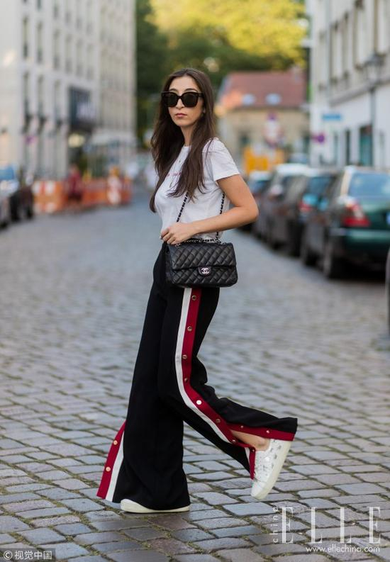 帅气复古的潮流女孩:T恤+镶边开衩阔腿裤