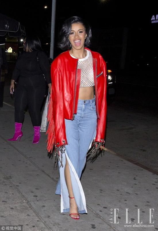 张扬性感的摇滚辣妹:短上衣+开衩牛仔阔腿裤