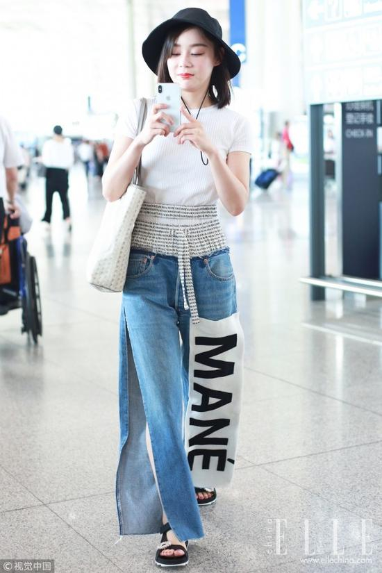 王珞丹同样选择了T恤+开衩阔腿裤的组合,黑色V领T恤朴素低调,白色开衩阔腿裤的收腰设计略带运动感,完美凸显纤细腰肢,搭配的白色缎带草帽更增添了一股度假风情。