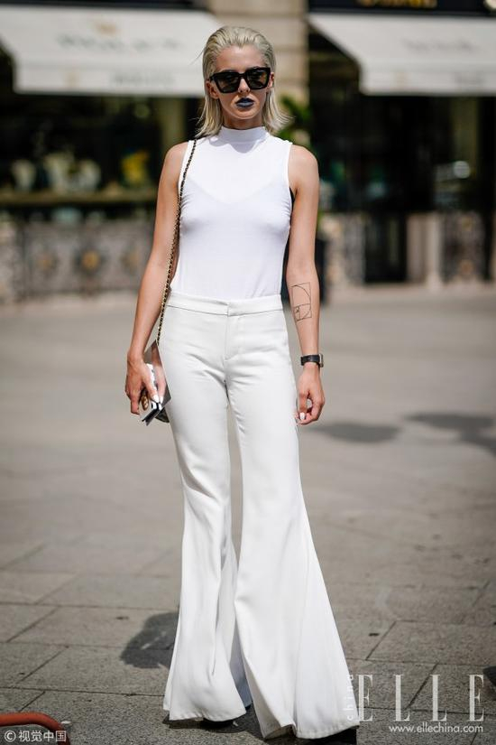 同色系搭配省心又省力,即使搭配一件款式保守的上衣去上班,有了开衩阔腿裤的点缀也丝毫不会显得呆板。若是周末和姐妹逛街,那么穿一件清爽背心更是性感加分啦。