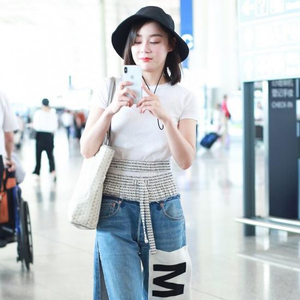 袁姗姗用白色T恤搭配牛仔阔腿裤的造型堪称教科书般的演绎了。牛仔裤的开衩高及大腿,清爽度UP。裤腿上的黑白字母贴片装饰与上衣的字母收腰设计相呼应,搭配一顶黑色渔夫帽,是休闲俏皮的欧美风女孩儿。