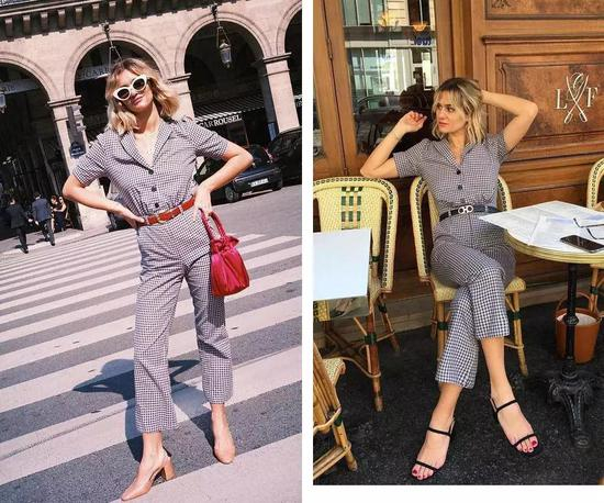 法国女生很爱穿one piece的单品,不管是条纹还是格子的元素,衬衣还是方领的细节,都给普通的款式增加了时髦感。连体裤+腰带的穿法,整套穿搭的细节设计感直线上升,再配上精致的手提包,立刻就有法式的感觉。