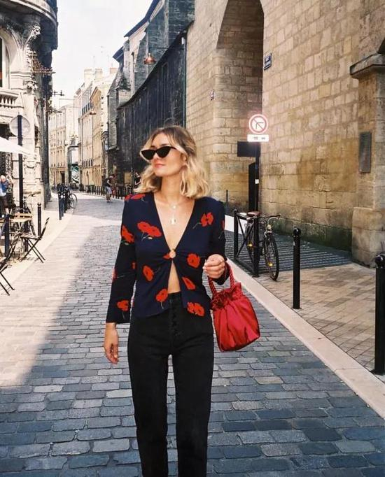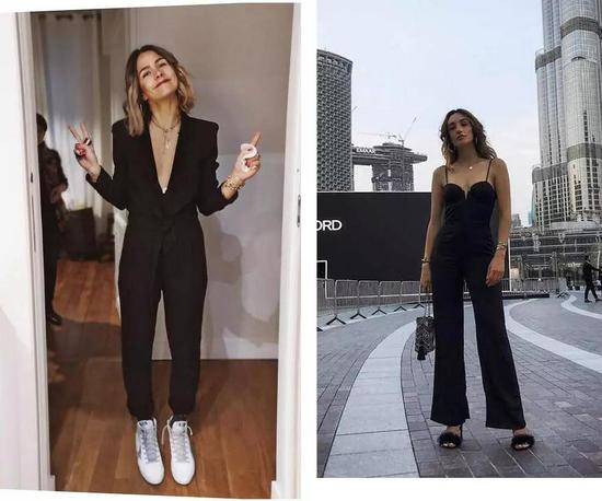 法国女人下班后的穿搭会更精致多样,大V领的连体裙,后背开镂空的设计,她们都很爱,搭配一些金色饰品比如腰带耳环会更出彩。